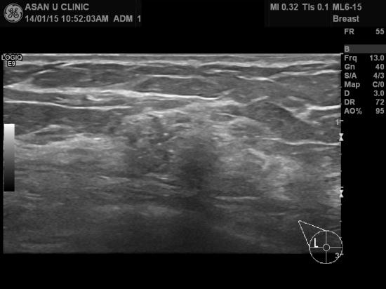 그부위 초음파를 통한 중심핵생검으로 우측유방에 침윤성 유관암이 진단되었습니다.