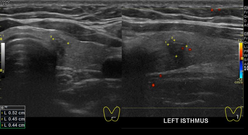 상기환자 검진이상으로 내원하신 30대중반 여성분으로 좌엽 의심스러운혹 세포검사진행후 갑상선암으로 진단되었습니다