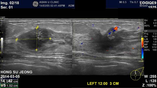 본원 초음파상 좌측유방 12시방향에 2.31 cm 의 결절과,