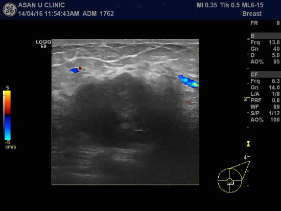 좌측 유방의 몽우리와 통증으로 내원한 55세 여성분입니다.