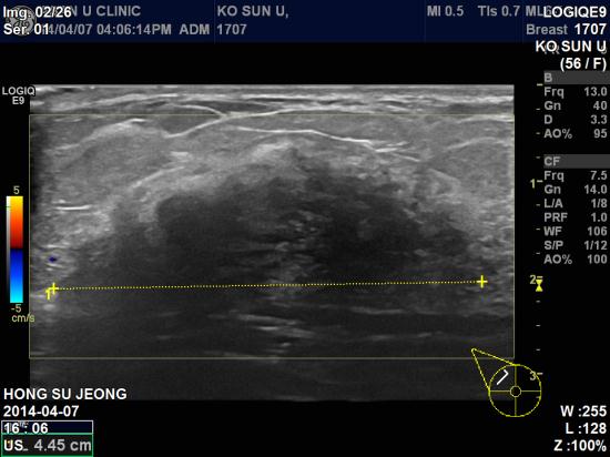 본원 초음파 상 우측유방 11시방향에 4.45 cm 의 종괴 및