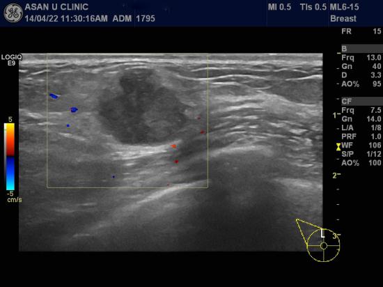 우측 유방에 몽울이 만져져 내원하여 유방초음파와 조직검사 실시하여