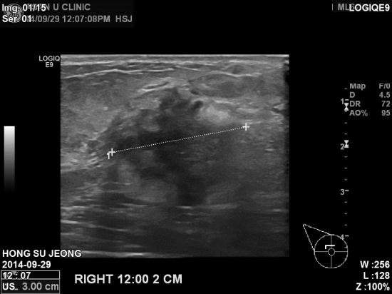 한달전 우측 유방에 멍우리가 만져지는걸 발견하여,검사 위해 내원하신 76세 여성입니다.본원 초음파 검사상 우측 유방 12시 방향에 3cm혹과,
