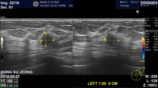 본원 초음파상 좌측 1시방향 젖꼭지 방향으로 8cm 떨어진 방향으로,