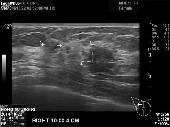 타병원에서 유방초음파 시행 후 우측 1cm 혹 소견보여
