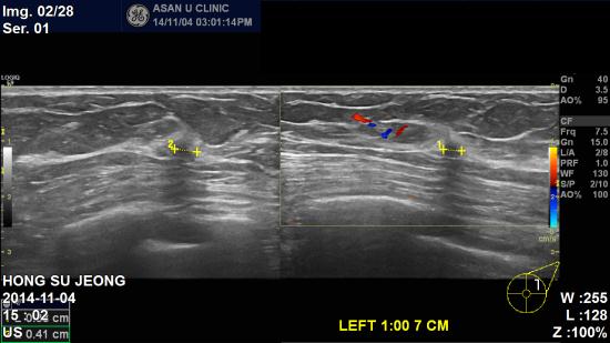 왼쪽유방 유두에서 7cm 떨어진 곳에 0.3cm 혹 발견되어