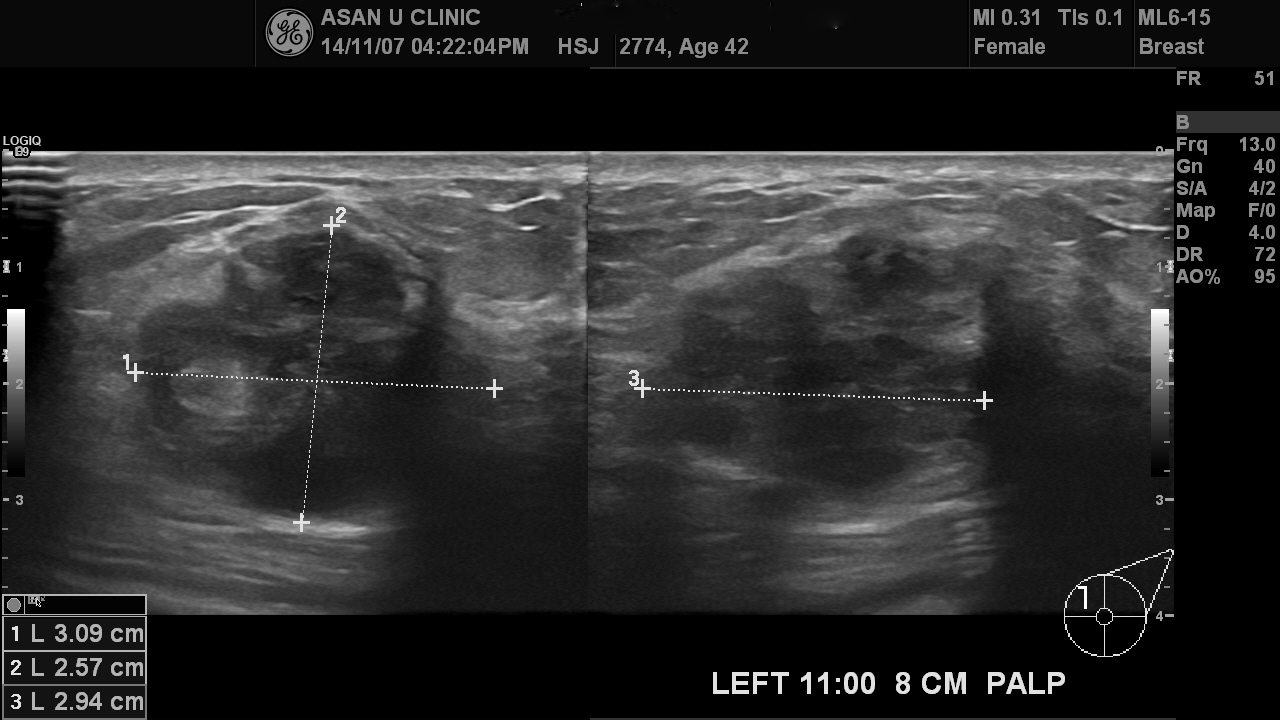 좌측 유방 상내측에 갑자기 만져지는 혹이 있어 내원한 42세 여성입니다.