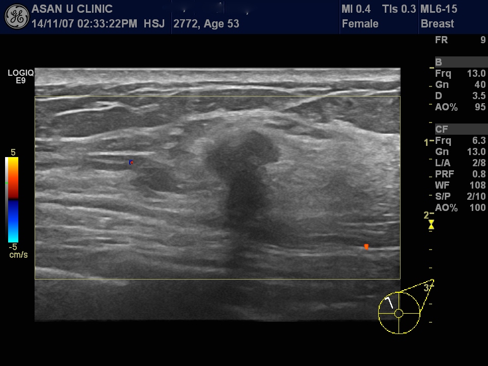 갑자기 만져지는 좌측 유방의 상내측 유방 멍울과 통증으로 내원한 53세 여성입니다.
