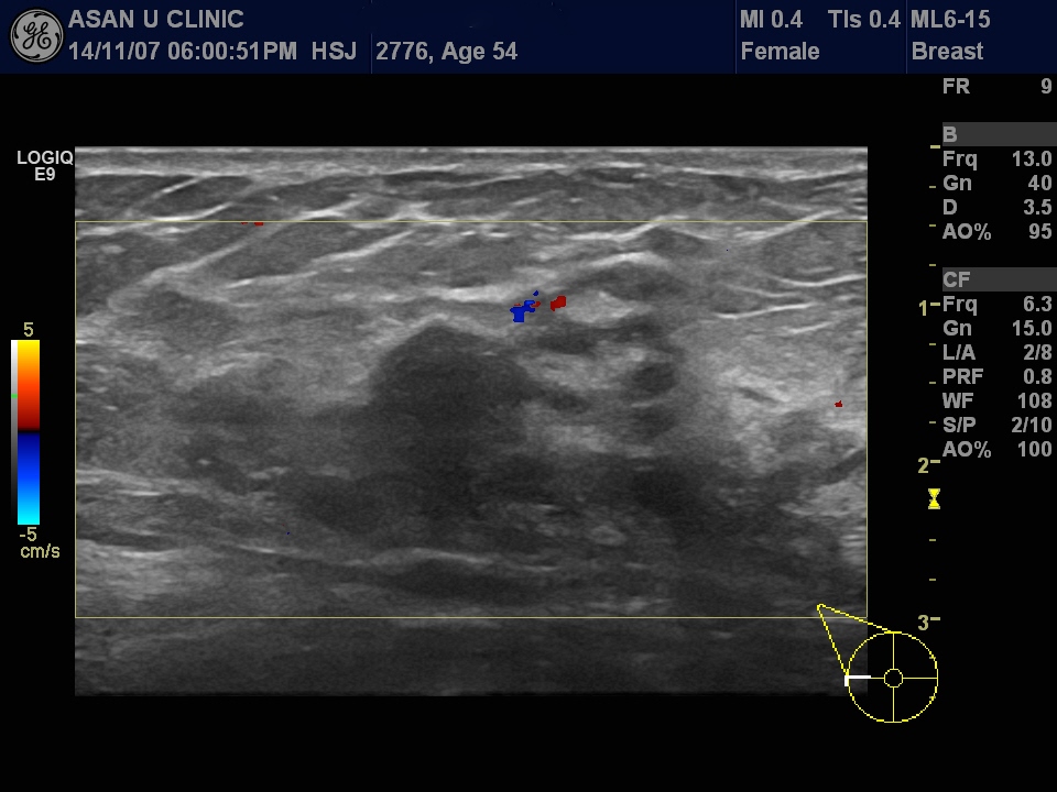 지속적인 우측 가장자리 부분에 통증이 있어 시행한 유방초음파상