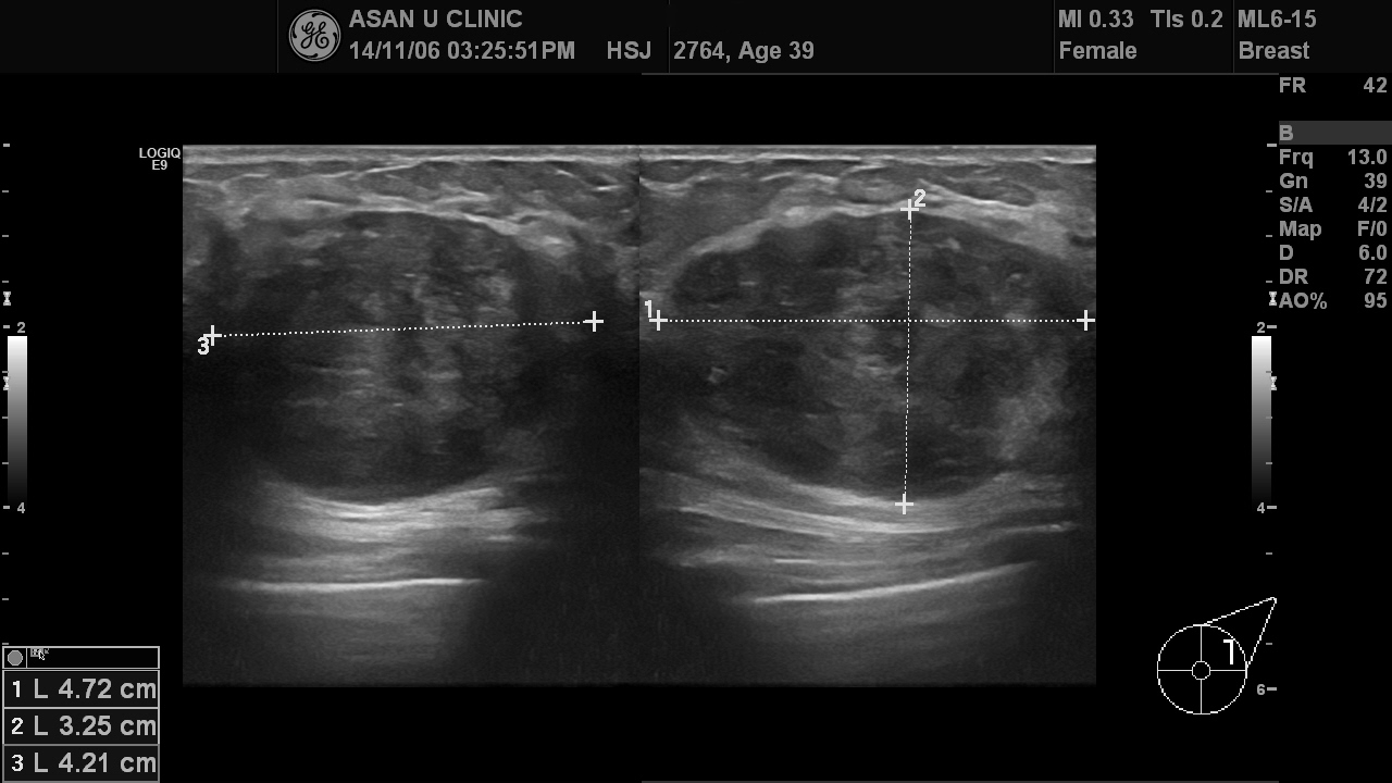 왼쪽 유방에 만져지는 몽우리로 내원한 39세 여성입니다.