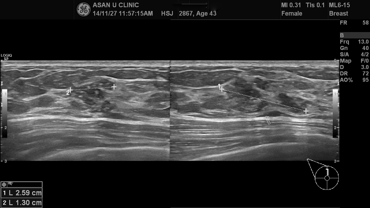 미세석회화와 불규칙 유관확장이 있는 오른쪽 유방의 상내측의 결절이었고