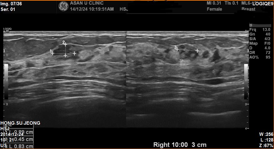 본원초음파 후 우측 10방향 유두에서 3cm 떨어진곳에 0.9cm혹을