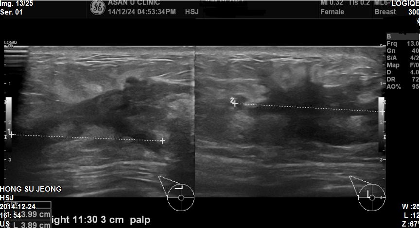 본원초음파상 11 : 30 방향에 3.9cm 혹과 겨드랑이에 림프절이 많이 부어있어