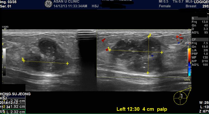 본원에서 초음파 시행 후 좌측유방 12 : 30 방향에 2.7cm 혹과