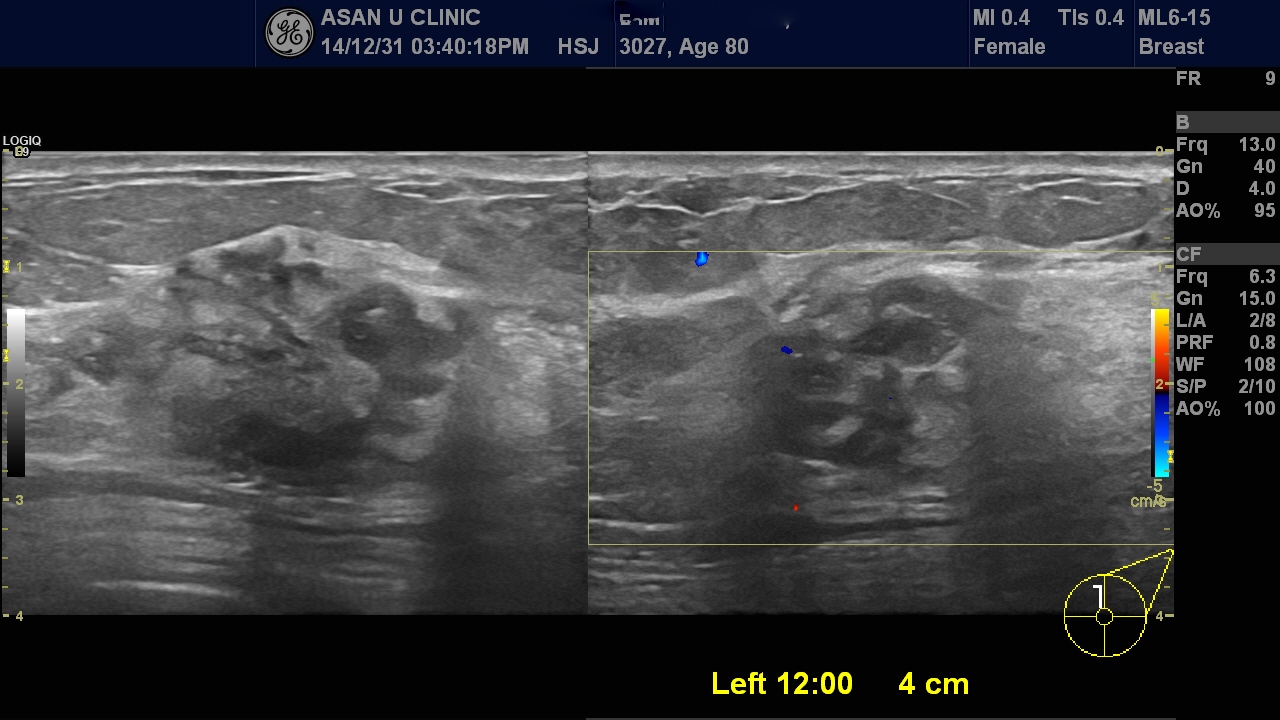 왼쪽 유방에 만져지는 몽오리로 내원하신 80세 여성분입니다.