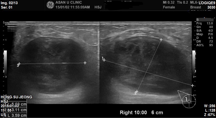 본원에서 유방초음파상 우측유방10시방향 유두에서 6cm 떨어진곳에 5.03cm의 혹이있었고