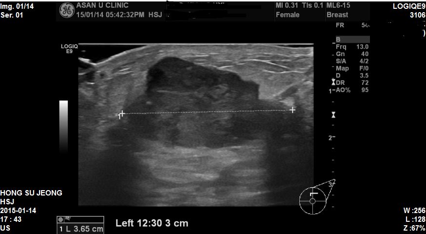 본원에서 왼쪽 12 : 30방향에 3.65cm 혹 조직검사하였고