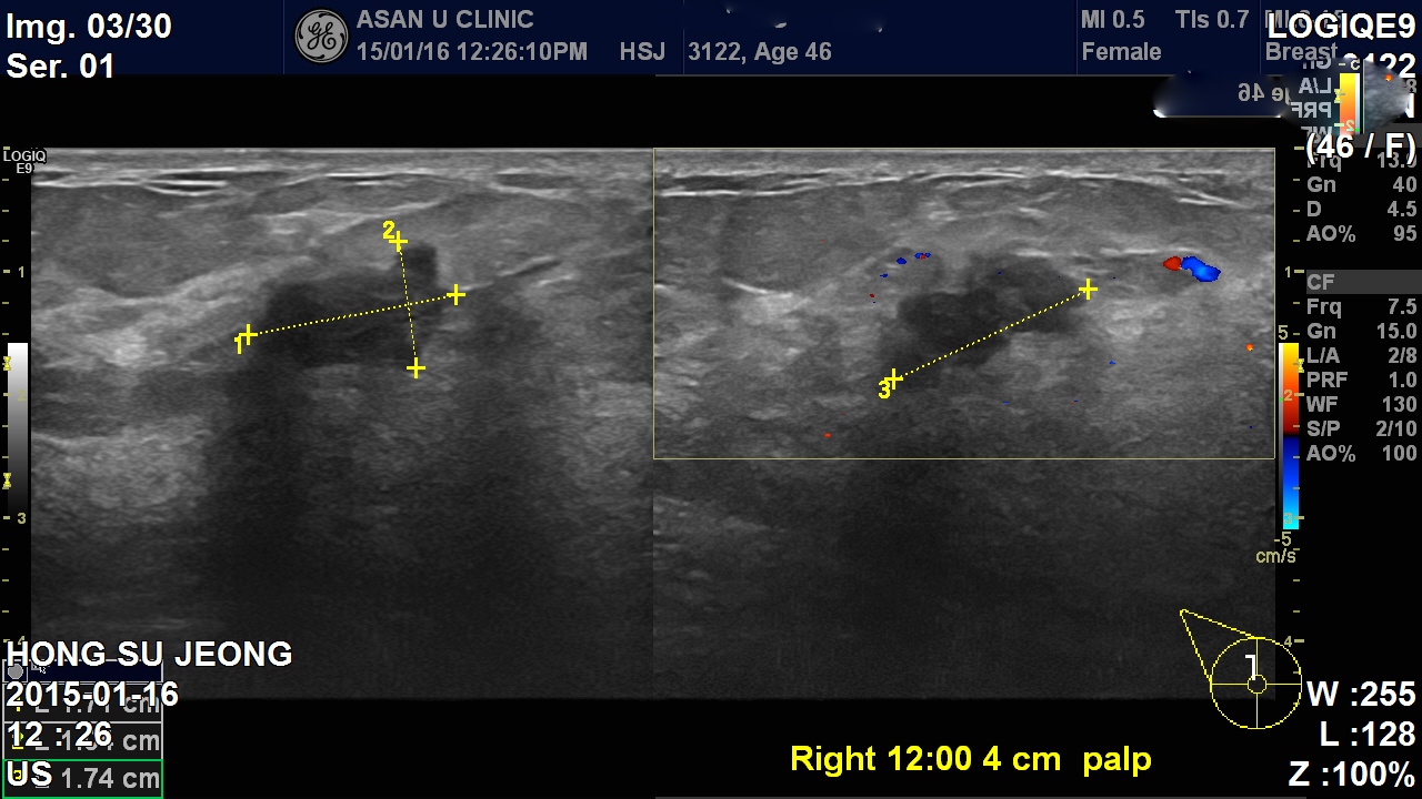 두달전부터 만져지는 우측 유방에 몽오리로 내원한 46세 여성분입니다.