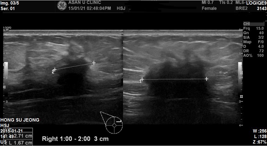본원에서 우측 상내측에 2.7cm혹 조직검사 시행하였고