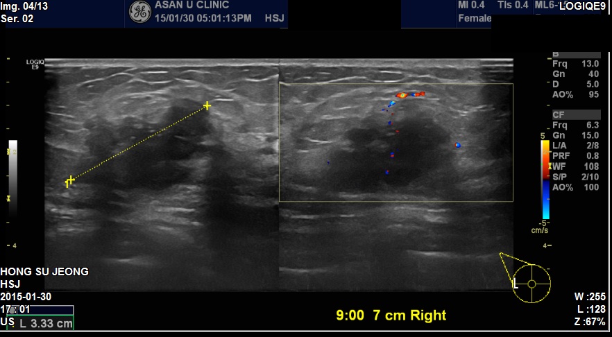 본원에서 우측유방에 3.3cm 혹과 겨드랑이에 만져지는 혹 조직검사 시행하였고