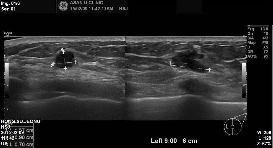 좌측유방 9시방향에 1.6cm 혹 조직검사 시행하였고