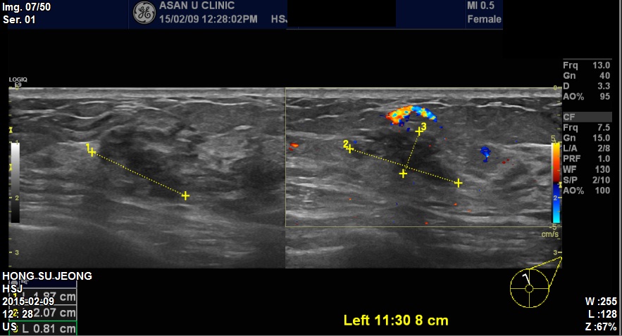 좌측유방에 3개의 혹 조직검사시행하였고