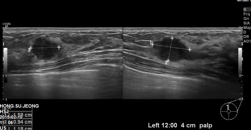 유방초음파 후 좌측유방에 1.58cm의 혹 조직검사시행하였고