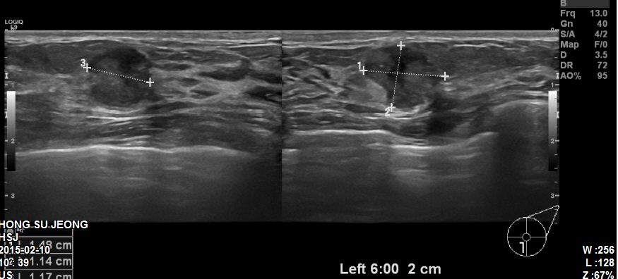 유방초음파 후 좌측유방에 1.48cm의 혹 조직검사 시행하였고