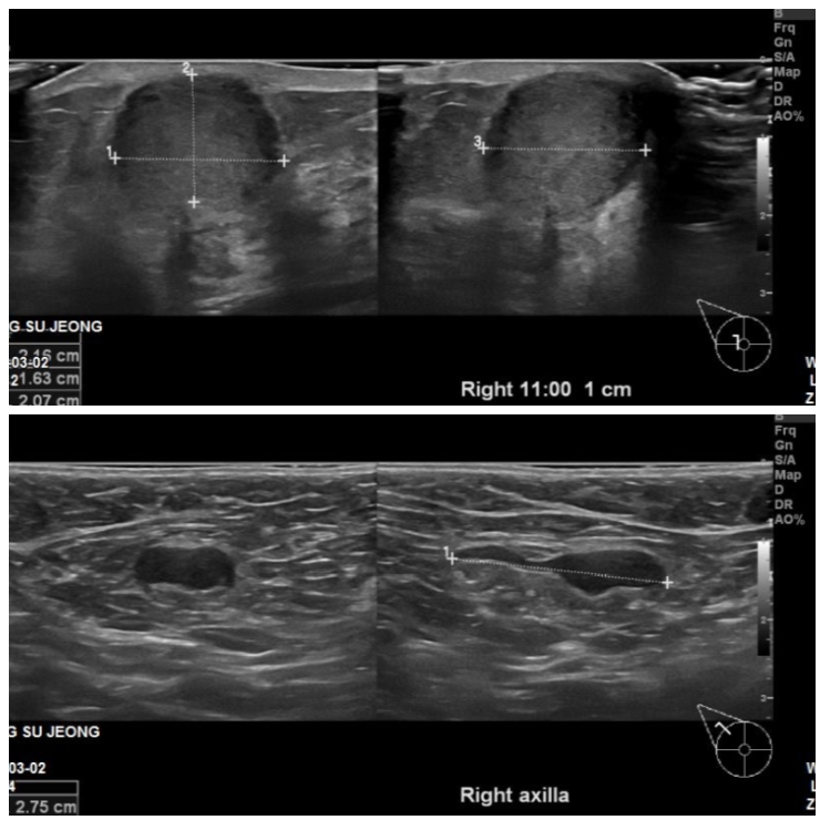 침윤성 유관암과 겨드랑이 전이로 진단되었습니다.