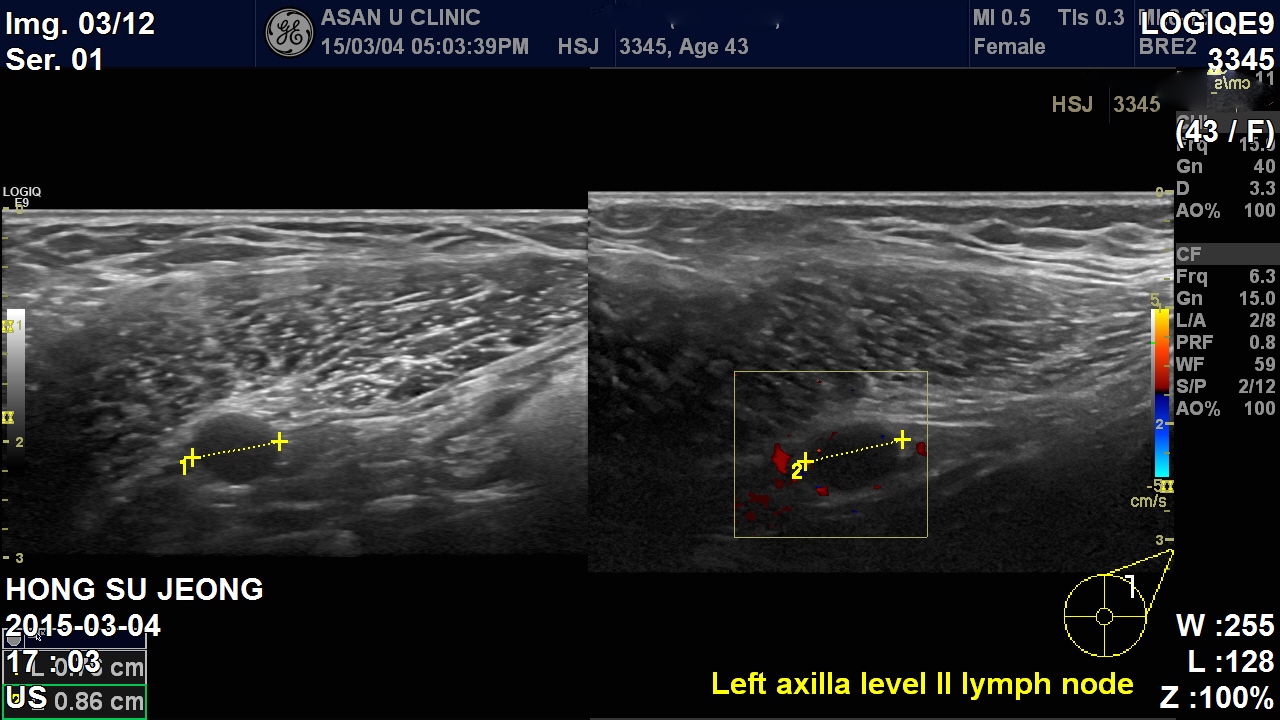 유방의 몽우리 조직검사 및 겨드랑이 림프절 세포검사====> 침윤성 유관암의 좌측 액와전이