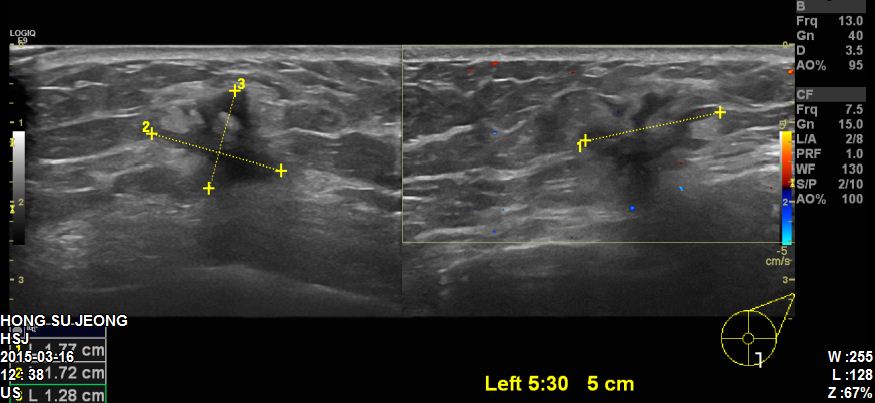 타원에서 진행한 초음파 확인 후 좌측유방 5 : 30 방향에 있는 1.7cm의혹