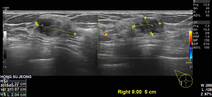 유방초음파 시행후 좌측유방에 8 : 00방향에 2.04cm의 혹을 조직검사 시행하였고