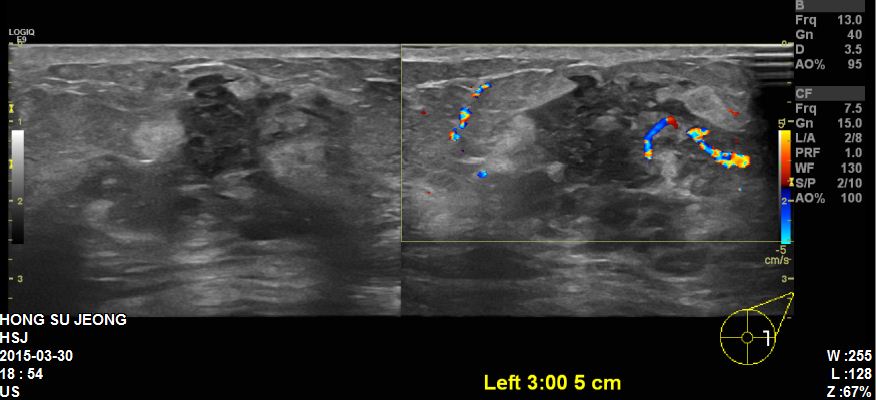 본원초음파상 좌측유방에 혹과 겨드랑이에 림프절 비대 확인하였고