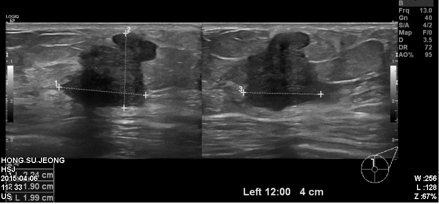 좌측유방 12시 방향에 있는 혹을 조직검사 시행하였고