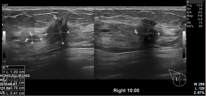 건강검진상 이상소견으로 내원하신 50대 여성 분으로 우측 10 :00 방향에서 5cm 떨어진