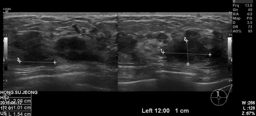 타원유방초음파상 확인되는 좌측유방12시방향의 혹과 좌측겨드랑이에 부어있는 임파선을