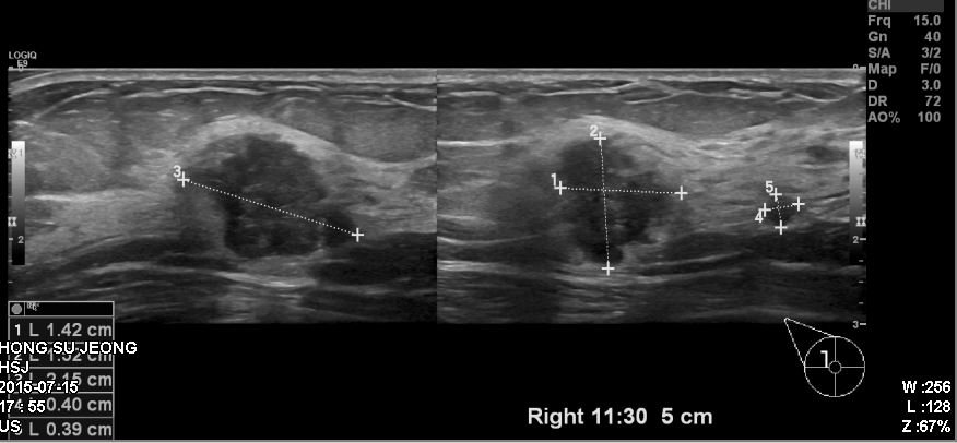 본원에서 우측 11:30 방향에 확인되는혹 조직검사 시행하였고