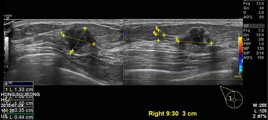 유방에 9시30분 방향에 3cm 떨어진 곳에 의심스러운 혹 조직검사 시행하여 우측 침윤성