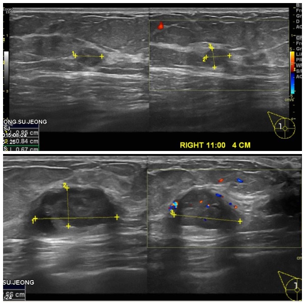 우측유방 12시방향 1cm떨어진곳과,11시방향 4cm 떨어진 곳에 조직검사 시행한 후