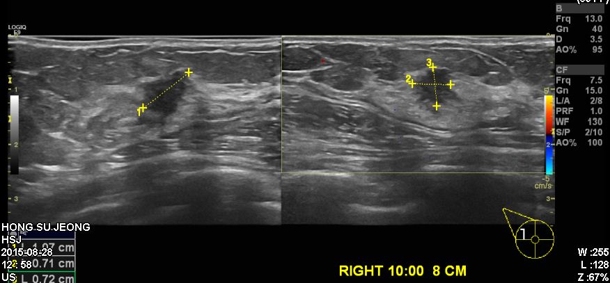 건강검진상 이상소견으로 내원하신 60대 여성분으로 우측 10시 방향에서 8cm 떨어진 거리에 의심스러운 혹 조직검사 시행하여 우측 침윤성 유관암 진단 되었습니다.
