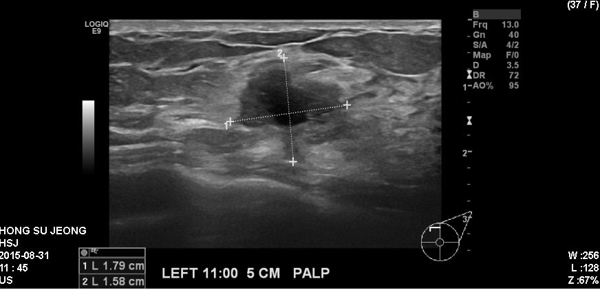 좌측 유방에 만저지는 몽우리로 내원하신 30대 여성분으로 본원에서 초음파 시행 후 좌측 11시 방향에서 5cm 떨어진거리에 있는 만져지는 혹 조직검사 시행하여 좌측 침윤성 유관암