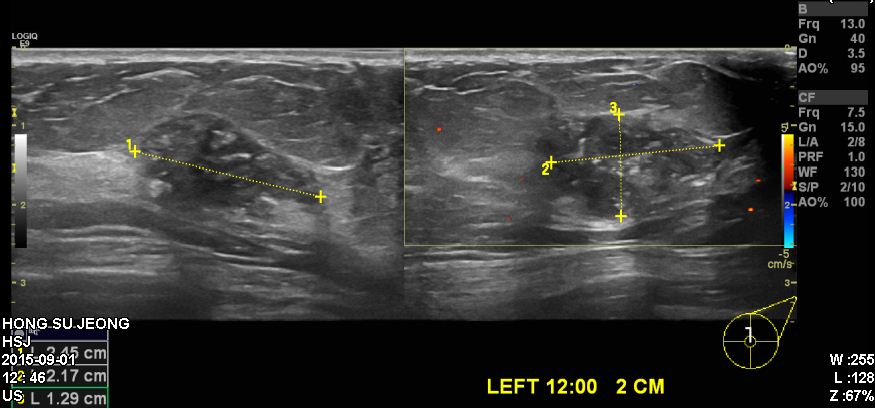 좌측 유방에 만져지는 몽우리로 내원하신 60대 여성분으로 좌측유방에 12시 방향에서