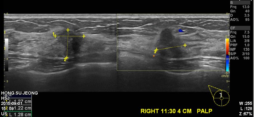 검진상 이상소견으로 내원하신 40 여성분으로 우측 유방 11시 30분 방향에서 4cm 떨어진
