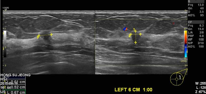 건강검진상 이상소견으로 정밀 검사 위해 내원하신 50대 여성 분으로 좌측 6시방향에서 1cm 떨어진 곳에 의심스러운 혹 조직검사 시행후 좌측 침윤성 유관암 진단 되었습니다.