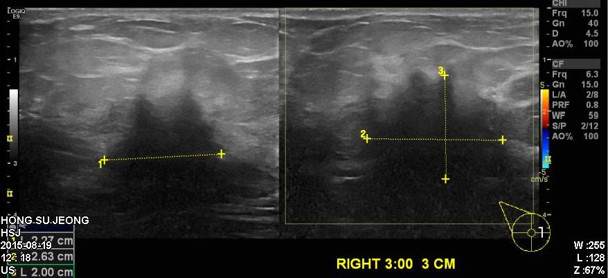 우측 유방에 만져지는 몽우리로 내원하신 60대 여성 분으로 우측 유방 3:00시 방향에서