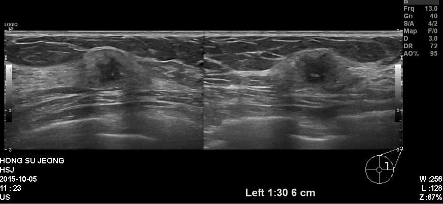 본원에서 시행한 초음파상 우측유방 1시30분 방향에 이전과 다른 양상보이는 혹발견되어
