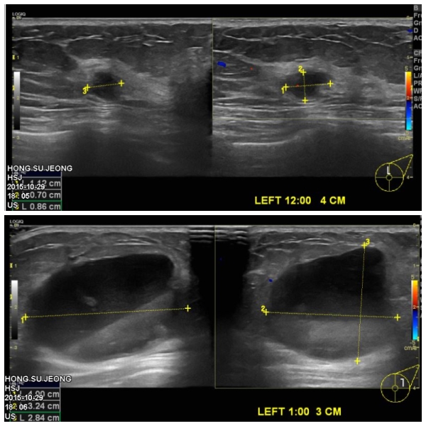 본원에서 유방초음파후 좌측유방에 12시방향과 1시방향에 의심되는혹 조직검사 시행하였고