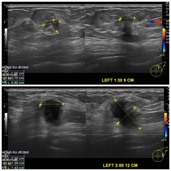 유방초음파상 확인되는 좌측유방에 2개의 혹을 조직검사 시행하였고