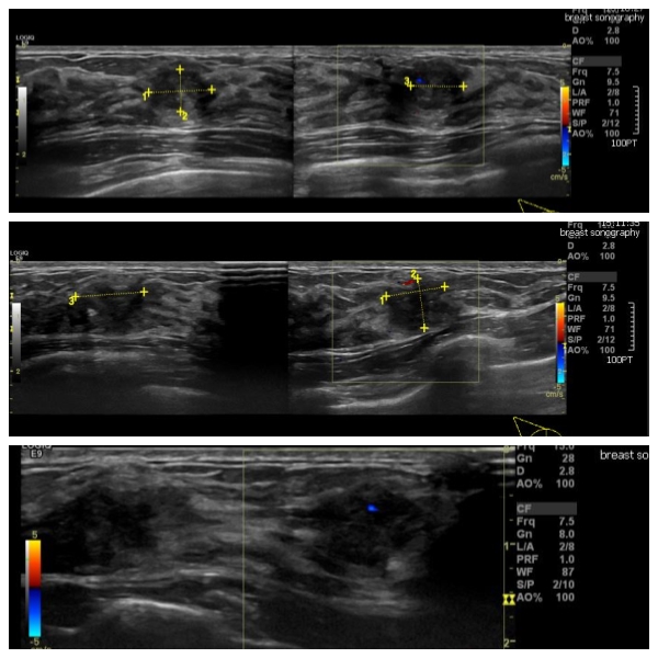 상기환자 우측 유방에 만져지는 몽우리로 내원하신 30대 여성으로 우측 7시 방향에 만져지는 몽우리와 7시 방향에서 3cm 떨어진 거리의 몽우리 조직검사 시행하였고, 침윤성