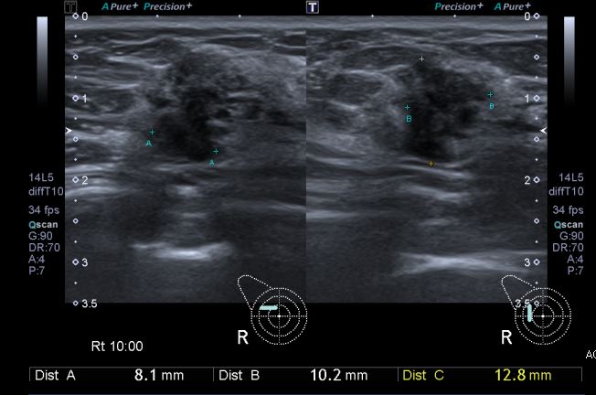 건강검진상 이상 소견으로 내원하신 40대 여성 분으로 우측 10:00 방향의 의심스러운 혹 중심핵생검 시행하여 우측 침윤성 유관암 진단 되었습니다.